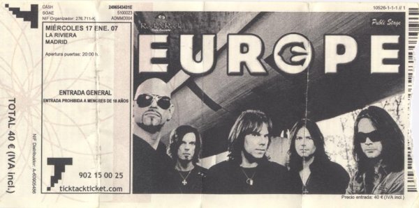 Dos años después de su última venida a nuestro país, los suecos Europe volvían a tocar entre nosotros, presentando su último disco “Secret Society”. El alto precio de las entradas (36 € más gastos anticipadas, 40 € en taquilla), unido al inconveniente que siempre supone tener un concierto un día de diario y el relativo poco tiempo trascurrido desde su última visita nos hacía temer por un posible pinchazo de público. Afortunadamente, nos equivocamos, La Riviera prácticamente se llenó, lo que da una idea del tirón del grupo entre el público español.