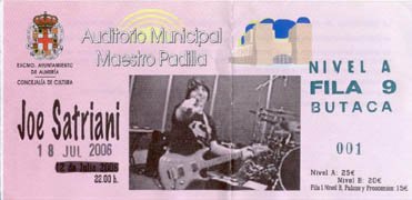El tiempo pasaba y el Ayuntamiento de Almería ya informaba en su programación cultural del concierto. Bien, aunque yo seguía un tanto escéptico, ya que en la página oficial del guitarrista no se colgaban las fechas por España. Eso sí, el concierto se anuncia en una fecha (12 de julio) y al final se cambiaba por la del 18, por lo que al ponerse a la venta las entradas hay un borrón en las mismas. El día que decidimos ir a por las entradas, a los pocos días de ponerse a la venta (en el mes de abril), pedimos diez en la parte de abajo del auditorio (nivel A, 25 € cada una). Creo que merece la pena gastarse algo más (nivel B, 20 €; palcos y proscenios, 15 €) y ver más de cerca al seis cuerdas y su banda. Sorprendentemente las primeras filas ya están vendidas (o asignadas y regaladas para gente del ayuntamiento). La publicidad en la ciudad es nula, como la mayoría de eventos organizados por el ayuntamiento de esta ciudad. Aún así, el boca a boca surte efecto y el día del concierto se colgaba en la taquilla el cartel de “Entradas agotadas”. Espero que tome nota el ayuntamiento y se de cuenta que el Rock también existe, aunque algo de buena labor hay, ya que no nos olvidemos últimamente del concierto de Frank Gambale, y el musical de Queen “We will Rock you”.