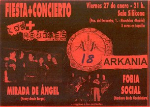Debido a pulsar una opción que no debía de la cámara digital al día siguiente borré todas las fotos de aquella noche, tanto de los grupos en directo, como de amistades y servidor. Así que tuve que ponerme en contacto con los grupos para que me cedieran fotos de aquella noche, respondiendo todos muy amablemente. Eternamente agradecido al batería José L. Caballero “Josito” (Mirada de Ángel), al vocalista Ángel Santamaría (Arkania), al final las fotos cogidas de la página web del grupo; y al batería Miguel Huertas (Fobia Social), también por el completo listado de temas.