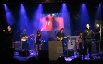 Cuatro, tres, dos, uno y aparecen en el escenario dos actores caracterizados de soldados, portando una antorcha cada uno, en las pantallas se lee “Derribemos el muro” mientras suena una sirena, de las de campo de concentración no las de cola de merluza. “Todos los derechos han sido violados” dice Raisa, cuando aparecen dos actrices derribando parte del muro de cajas de cartón para, por fin, verles la cara a los músicos. En la parte izquierda del escenario tenemos a Pablo Miquel empuñando una Telecaster, a su lado Eva (The dream of Eva) que se encargará de los coros, en el centro Gonzalo “Gox” Valdivia, cantante, guitarra, líder y cerebro del tinglado de la noche, y sí, os puede sonar su apellido ya que es hermano del gran Juan Valdivia, guitarrista de Héroes del Silencio, o porque tiene en el mercado tres discos con la banda El Alquimista: “El alquimista”, “Babia” y “La última carta de Sandinoche”. En la parte derecha tenemos, clavada con puntas del ocho a Queen Faci, bajo y teclado, y detrás de ella a Diego Gaudini sacándole punta a las baquetas. El equipo se completa con Víctor Recua a cargo de visuales y animaciones y el grupo de teatro Jeribeque (María, Sergio, Óscar y Pilar) que se encargará de ir representando varios de los personajes y escenas que aparecen en la película “The Wall” de Alan Parker durante todo el concierto.