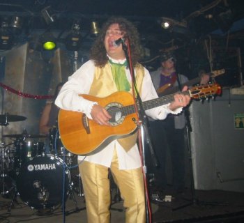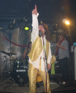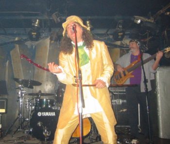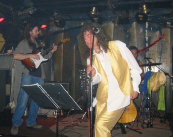El concierto estaba anunciado a las 22:30 y sorprendentemente (la experiencia indicaba lo contrario) no se hicieron esperar. Los músicos se fueron colocando en el pequeño escenario. Javi Bermejo (guitarra) y Chema Fernández (batería) repetían del año anterior, y el puesto de bajista lo ocupa hoy Antonio Reyes. La entrada en escena de Miguel Oñate fue realmente impactante, con un impecable traje dorado con bastón y sombrero de copa. Como una imagen vale más que mil palabras, por aquí tienes unas fotos que explican mejor que yo la imagen que buscó el carismático cantante para ese día.