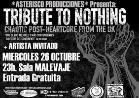 Los británicos Tribute To Nothing iniciaron el 19 de octubre en el Gaxtetxea de Andoain (Guipúzkoa) su gira, de nada más y nada menos doce conciertos, por la Península Ibérica. La fecha en la capital almeriense era su octavo bolo de la extensa gira, y una vez más los encargados de que grupos de tal guisa arriben a la provincia, donde las ranas llevan cantimplora y escupen hacia arriba para que les caiga algo de líquido, eran Asterisco Producciones, promotora de conciertos que está realizando una excelente labor, trayendo a la pequeña ciudad del sureste del estado muy buenas formaciones internacionales de Hardcore y encima con entrada gratuita. ¡Atención a los próximos conciertos que organicen!