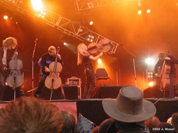 El siguiente turno era para los fineses APOCALYPTICA. La sinfonía de destrucción. Los cuatro chelistas, con la adición de un batería, excelente, por cierto, obtuvieron una buena respuesta del público asistente, gracias a la originalidad de su propuesta, Cello Rock, en su propia definición, más la serie de versiones, alternadas a su propio material, pidiendo nuestra participación, cual karaoke. Curioso ver a Eicca y Perttu moviendo la cabeza como locos y levantándose, están sentados la mayor parte del tiempo, con el instrumentito de marras a un lado y otro del escenario. Paavo participa menos y el otro chelista, más clásico y asalariado, simplemente, se dedica a tocar y cobrar. El sonido fue bueno en términos generales. Algo más de presencia de la caja de la batería, perdida en muchos momentos, fue el lapsus más importante.“Life burns”, “Bittersweet”, “Master of puppets”, “Fight fire with fire”, “Somewhere around nothing”, “Path”, “Inquisition symphony” y “Reign in blood” fueron algunos de los temas desgranados en su hora. Terminaron con su versión del clásico de Grieg “Hall of the mountain king”, con los últimos rayos solares del día despidiéndose, a su vez.