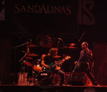Al igual que había pasado con Wurdalak, Sandalinas salió al escenario sin haber probado sonido. Esa circunstancia, unida a que en uno de los primeros movimientos, Jordi Sandalinas tiró al suelo el cabezal del amplificador, provocó un comienzo del show bastante caótico. Mientras los pipas intentan arreglar el desaguisado, transcurre el primer tema “The Conqueror”, con más pena que gloria, sin poder apreciar apenas nada por la falta de sonido: La batería golpea directamente en los micros, el bajo se oye difuso y la guitarra… simplemente no se oye, únicamente nos llega su sonido por lo que sale de monitores. En fin, un desastre.