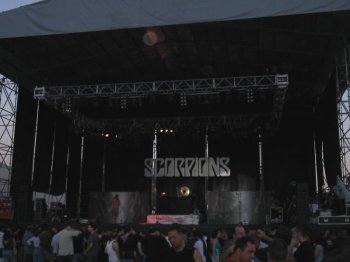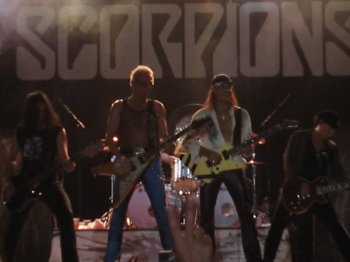 Un nuevo salto en el tiempo nos lleva a la actualidad, con el tema “Deep And Dark” de su último disco. Hay que reconocer que los nuevos temas no han calado en el público como los clásicos, así que pasó con más pena que gloria a pesar de que la actitud de la banda fuera la misma. Al término de la canción, Klaus Meine desaparece del escenario, y la banda comienza uno de los temas instrumentales que causan mejor efecto en un concierto: “Coast To Coast”, para el que pronto se une Meine con una tercera guitarra. A diferencia de la mayoría de los temas instrumentales que tienen los grupos, “Coast to Coast” no pretende hacer exhibición de técnica musical, sino que tiene personalidad propia, y que siempre es aceptada con júbilo por el público, sensación que consigue de igual forma “Into the Arena” del hermanísimo. Esta comunión con el público produce que, tras medio concierto, Matthias Jabs parece que despierte del letargo y se una al show visual. Quizás los dolores producidos por la caída del día anterior remitieran o quizás su profesionalismo le permitiera sobreponerse a ellos, pero el caso es que se unió a la coreografía ensayada para el tema.