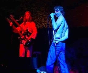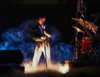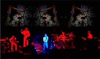 Una locución nos introduce en la historia de Rael y la banda acomete “The Lamb Lies Down On Broadway”, tema homónimo que abre dicha obra. Aparece, finalmente, Denis Gagné, quien se mete en la piel, y atuendos, de Gabriel. Si no es porque la voz no es perfecta en la imitación, y el sonido de la banda es algo más vigoroso, sobre todo la batería, empezaríamos a pensar en que nos la están dando con queso. Playback. Denis/Gabriel se mueve por el escenario usando los tres micros. Tanto los dos traseros, mencionados antes, como el anterior central. Lo hará durante todo el show. “Broadway Melody Of 1974” es un desfile de personajes por las pantallas. Desde Marilyn a Groucho, En “Cuckoo Cocoon”, tras iluminarse tenuemente el escenario, descubrimos al vocalista tirado por los suelos, micro a la altura, cantando y tocando la flauta. Ya le tomamos por Gabriel. Parece necesitar su tiempo para calentar la voz. Sus teatrales movimientos me recuerdan a lo visto del cantante de Genesis en sus videos como solista. Desgraciadamente, no he visto ninguna filmación de la banda original para comparar.