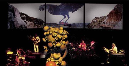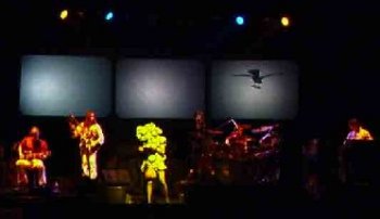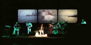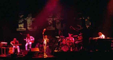 Observando la puesta en escena de la banda uno entiende por completo la definición de rock sinfónico acuñada en aquellos tiempos. La puesta en escena recuerda a una formación clásica, reducida a la mínima expresión, cuatro elementos en este caso. Cada músico de la banda tiene su pedestal sobreelevado. Los dos exteriores, más adelantados, el izquierdo para el guitarrista y el derecho para los teclados. Los dos interiores, más retrasados, para el bajista, a la izquierda, y el único de pie, el resto están sentados, situándose el batería en el derecho y dejando un pasillo central para uso del vocalista. Cuando ocupa la parte central anterior, si nos diese la espalda y elevase los brazos, podría pasar por el director del conjunto. Hay sendos micrófonos dispuestos en las esquinas posteriores, tanto izquierda, bombo incluido, como en la derecha. Haciendo de telón, tres enormes pantallas, en línea, y debajo de la central, una especie de rocas.