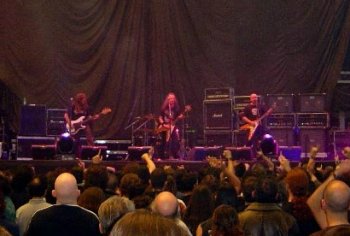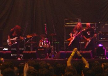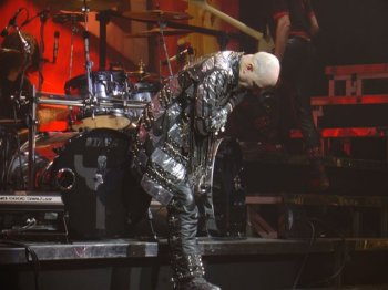 Judas Priest estaban anunciados para las 21:00, y con exquisita puntualidad británica se apagaron las luces. En las pasarelas laterales se colocaron dos banderas blancas con el logo de Judas Priest, y tras el escenario surgió un enorme ojo, tal y como aparece en la portada del DVD “Electric Eye”. El iris del ojo era un láser rojo que dibujaba figuras en la gente. Realmente impactante.