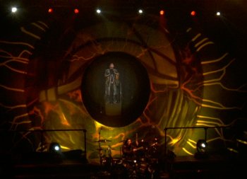 Otro golpe de efecto: El telón trasero se cambia, siendo sustituido por uno gigantesco con la imagen de la portada de “Angel of Retribution”, dando paso al primer tema nuevo de la noche, “Judas Rising”. La aparición de Halford es espectacular, ascendiendo en un pequeño podio tras la batería y delante del telón, haciendo el mismo gesto con los brazos que el personaje de la portada del disco, y con un simulacro de hoguera a sus pies.