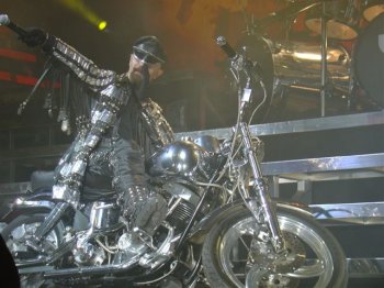 Llegó el momento del viejo paripé de “me voy, pero ahora vuelvo”, con lo que se quedó el escenario vacío, hasta que por los altavoces empezó a atronar el tubo de escape de una Harley Davidson, con el consiguiente griterío del público cuando se vio aparecer a Halford montado en una verdadera Harley hasta el centro del escenario. El numerito ya tiene un montón de años pero sigue siendo igualmente efectivo. El tema elegido para comenzar el bis no puede ser otro que “Hell Bent For Leather” que es cantado sin bajarse de la moto. La entrega de grupo y público es total, y el final del concierto iba a tener un plus de intensidad.