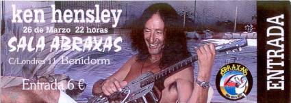 El mago del Hammond y de los teclados, músico y compositor de la época dorada de Uriah Heep, el gran Ken Hensley, desde hace unos cuantos años está afincado en España, más en concreto en un pueblo de la provincia de Alicante. Esa misma noche descubrimos el motivo que le ha hecho echar raíces aquí, una preciosa y bella mujer morena de nombre Mónica. Alejado del show business sigue sacando discos en solitario o en compañía de antiguos amigos (Wetton, Lawton…), y tocando en ocasiones en pequeñas salas o pubs del levante español, así como alguna que otra actuación en el extranjero.