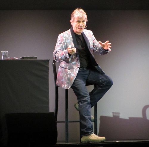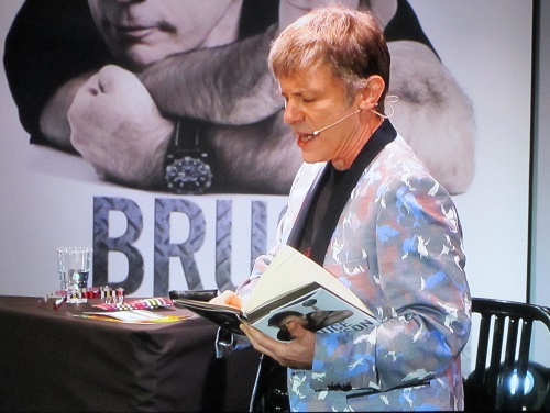La espera fue amenizada bebiendo cerveza, charlando con otros asistentes y pensando qué preguntar a Bruce, mientras sonaba una banda sonora compuesta por temas de su carrera en solitario (si no me equivoco, los mismos que pudimos escuchar dentro del documental “Scream for me Sarajevo” el mes anterior). Con “Road To Hell” de fondo, Bruce salió a escena con un inmejorable aspecto tras superar el cáncer (eso sí, vestido con una americana de indescriptible estampado y vaqueros). Derrochando sentido del humor y frente a una pantalla en la que se proyectaban algunas de las fotos incluidas en el libro, Bruce no siguió el guión establecido al pie de la letra. Bien es cierto que en la primera parte leyó varios entretenidos fragmentos de la autobiografía, pero también describió cosas relacionadas con su vida y sus influencias, se rió de sí mismo y las ropas que llevaba puestas en las fotos, y bromeó constantemente, intercalando todo tipo de divertidas anécdotas. Tras 45 minutos de anárquica y divertida interacción en el mejor estilo de Monty Python, Bruce dijo que era hora de un pequeño descanso antes de la sesión respondiendo a las preguntas que los asistentes habían escrito en las tarjetas dejadas a tal efecto.