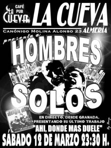 Un grupo cojonudo, si ya en disco son buenos en directo ganan mucho más, muy conjuntados y sonando muy compactos. Si hubiera justicia estos Hombres Solos deberían ser más arropados y deleitar las orejas de mucha gente, creo que poco a poco lo están consiguiendo, se lo merecen. No pierdas la oportunidad de verlos si pasan por tu zona. Vas a disfrutar con un buen trío de Rock con muy buenos temas, palabra. Si me haces caso y estás de acuerdo conmigo me lo cuentas, ¿vale?