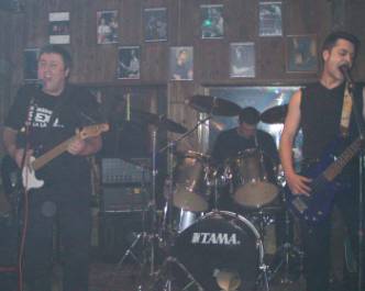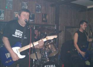 El rico y refrescante zumo de cebada seguía corriendo (ya llevábamos unos cuantos de antes), ¡y lo que corrió por nuestro gaznate! (así acabé yo esa noche, de vergüenza, ¡sick!). Cuando faltaban veinte minutos para la una de la madrugada los tres músicos subían al pequeño escenario, se corría la cortina roja y daban comienzo con “La casa del callejón”, canción que da título a su primer disco editado en 1998 en su primera etapa. Era mi primer contacto auditivo con el grupo (aunque luego me di cuenta que no, que había escuchado temas suyos en algún garito de la ciudad), y a que hace ya mucho tiempo que no me bajo música de Internet, aunque siempre está bien para saber lo que puedes encontrarte al ir a ver a un grupo desconocido. El caso es que ese primer tema me pareció buenísimo, Rock and Roll bien hecho y tocado.