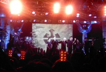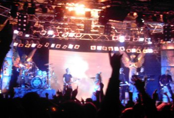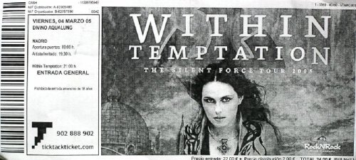 Un telón con uno de los últimos logotipos de la banda escondía el escenario. A las 9:45 sonaba la “Intro”, apertura de su nuevo trabajo, “The Silent Force”. Tras ella, desaparece el telón y la banda ataca “See Who I Am”, previsible. El fondo central del escenario lo ocupa una gran pantalla de video. A ambos lados dos estatuas representado sendos ángeles. Escoltando a éstos, y a los lados del escenario, dos grandes columnas, de reminiscencias egipcias, con inscripciones de heterogéneo origen y con plantas cayendo sobre ellas. Los angelotes guardaban las espaldas al batería, a nuestra izquierda, y al otro lado, al teclista. Éste llevaba el peinado punk por excelencia, mohicano. Poca relación tienen teclados y punk. En el centro se ubican los dos guitarristas y el bajista. Todos visten de negro. Oímos la voz angelical de Sharon den Aden empezando a cantar, pero no la vemos, en guiño halforiano. Aparece tras los primeros versos y se sitúa en el centro, lugar que pocas veces abandonaría. Se lleva una mayor ovación de bienvenida frente a sus compañeros. Es la estrella de la banda, y el resto lo asume. Viste un traje de larga y ancha falda y corpiño blanco con tiras negras. Empieza con un típico meneo de brazo y mano derecha, con la otra sujeta el micro, en un cruce entre baile oriental y flamenco. Igualmente, lleva una especie de joya, o cristal, entre las cejas, de clara inspiración hindú. La voz, excelente. Lo mejor de la noche.
