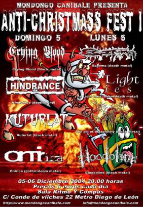 El festival con un atractivo título ante la inmediación de las, cada vez más, hipócritas Navidades, era organizado por la discográfica, distribuidora y webzine Mondongo Canibale. Es una lástima que no hicieran entradas (a 6 € cada día) como el cartel del evento, y tampoco hubiese estado nada mal camisetas con el mismo motivo. Pero nada, en el puesto que pusieron de material había vinilos y CDs que vende la distribuidora en su catálogo y poca cosa más.