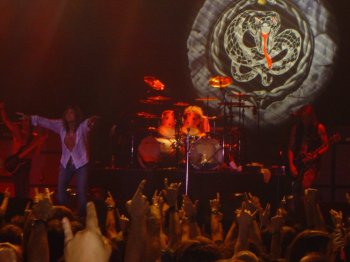 El primer ‘momento mechero’ llegó con “Is This Love”, y si ya clavaban los solos en el resto, en esta lo mejoraron de largo. Coverdale seguía más chillón que de costumbre (los años y el desgaste), la serpiente del telón iba cambiando de color con los focos frontales y unos filtros para la ocasión, y Reb Beach que se salía directamente en “Give Me All Your Love”. Precisamente una de las buenas cualidades de Whitesnake ’04 es la calidad de los músicos que componen el grupo, y la pareja de guitarristas demostraron a lo largo de las casi dos horas de concierto que son de lo mejor que anda por ahí a las seis cuerdas. Dos estilos distintos, un Doug Aldrich más clásico, muy a lo Randy Rhoads (¡¡incluso en el físico, increíble!!), mientras que Reb Beach contrastaba con un estilo mucho más moderno, y en ambos casos extremadamente precisos.