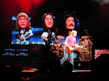 Con unos minutillos de retraso empieza el show con una filmación. Las proyecciones nos acompañarán durante todo el show, siendo parte importante en momentos puntuales. Jerry Stiller, padre del famoso Ben, y para que lo situéis, el padre del gordito en la serie Seinfield, nos da la bienvenida, o eso creo, embutido en una camiseta con el famoso logotipo de la banda y subtitulado en checo. Cortesía para el país anfitrión. Un medley inicia el concierto propiamente dicho. Reconozco extractos instrumentals del “Fiding My Way”, “Anthem”, “Bastille Day”, “Cygnus X-1”, “Passage To Bangkok” y “Hemispheres-Prelude”. Todas de la primera época de la banda, sin salir de los setenta. El primer tema completo es “The Spirit Of Radio” (de “Permanent waves”), le sigue “Force Ten”, ya de la década de los ochenta, y saltan a los noventa con “Animate” (tema que abre “Counterparts”).