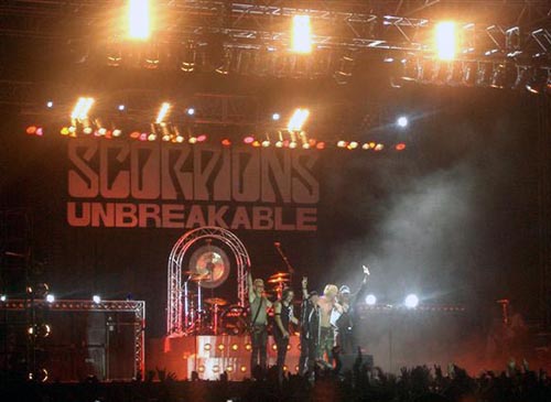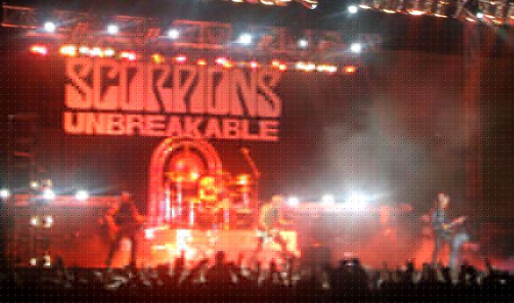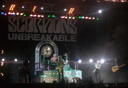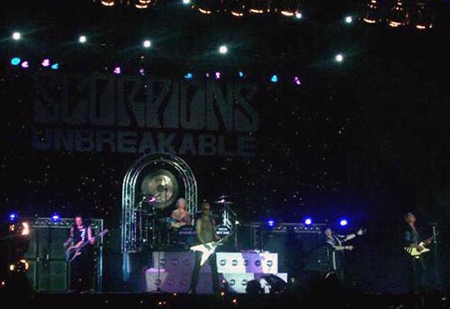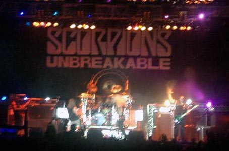 Cerca de las doce y cuarto de la noche, con un gran telón negro de fondo con las letras clásicas del grupo y el nombre del nuevo disco (telón que también acompañó a los maquillados de New York) sonaba la introducción del primer tema de su reciente CD, “New Generation”, para pasar a tocarla el grupo en vivo. Se notó bastante la diferencia del sonido del que gozaron los americanos al que tenían ahora los germanos, estos sonaron con más potencia, escuchándose todo perfectamente y de manera nítida, un excelente sonido. Rudolf Schenker, cuando no tocaba la eléctrica, ponía sus dedos sobre una guitarra acústica que tenía delante de sí apoyada en un pedestal. Coros de James Kottak y del nuevo bajista. Maine (con gorra y gafas oscuras) repartiendo palillos de batería (como también hizo durante más temas) y tras acabar el tema de marcado ritmo, se dirigía diciendo: “¡Buenas noches, Granada!, ¿cómo estáis?”, siendo respondido por una gran ovación.