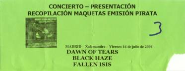 Ya con El Pirata rondando por la sala y lanzando camisetas desde el escenario, pero sin aproximarse al borde, como desganado, esperábamos la última actuación de la noche. Cuando faltaba cerca de un cuarto de hora para que el reloj marcara las dos de la madrugada El Pirata soltaba unas palabras, agradeciendo el estar allí en la noche de sábado (¡era viernes!, aunque si somos estrictos, sí era sábado, el reloj hacía tiempo que había pasado de la medianoche) y dando paso a los madrileños DAWN OF TEARS.