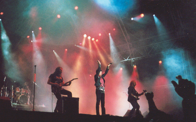Sobre la 1:40 aparecieron en escena los Medina Azahara, esta vez tocando ellos mismos la intro que abre su nuevo CD “Aixa” llamada “Puerta al mundo”. El sonido ya de un principio era simplemente perfecto, y como un puñetazo en la cara cayó la versión recortada de “A toda esa gente”, para inmediatamente después y sin descanso tocar “Vivir por la Paz”, tema perteneciente a su último álbum.