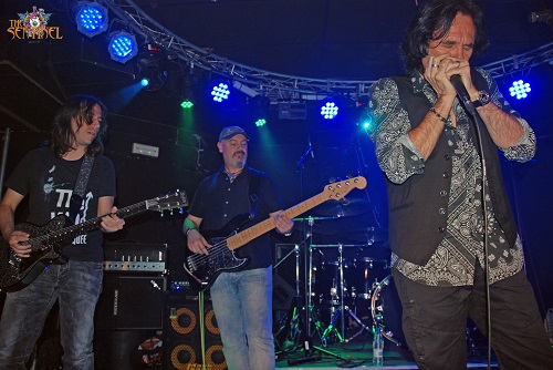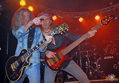 Ahí no quedó la cosa. José Martos fue a su sitio natural, la batería, relevando a Fernando Cobo, y Jorge Salán anunció “vamos a tocar una de Gary Moore”. No hico falta más, los primeros acortes de “Walking By Myself” levantaron a todo el público. El tema fue cantado por el propio Jorge Salán y tanto él como Juanjo Melero se fueron alternando en los solos, mostrando su conocida y prodigiosa técnica. Uno de los momentos de la noche.