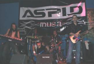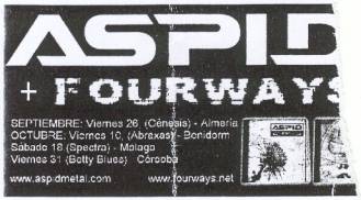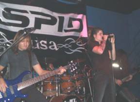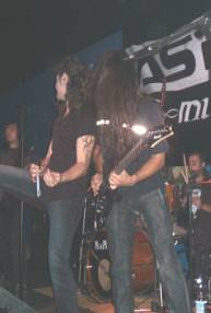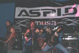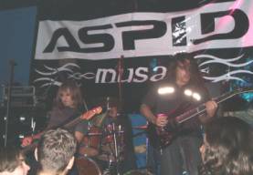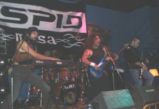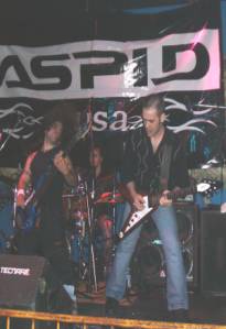 Faltando un par de minutos para que dieran las 23:45 h. el cuarteto sevillano se plantaba en las tablas (con el telón de ÁSPID a sus espaldas) e iniciaban su actuación encadenando la “Intro (Babylon)” con “Long Way ´02” y “Shipwreck”. El sonido era ensordecedor, aunque luego nos fuimos acostumbrando. De los coros se encargaban el guitarrista Pedro Valladares (que con el bajista y cantante, Ricardo Carmona “Rikky”, formaron el grupo entre 1999 y el 2000) y el teclista Elías Ramírez (junto al batería han sustituido a los que entraron a finales del 2000 y grabaron el disco, Francisco Rodríguez y Jorge Moreno, respectivamente). Dando mucho juego en vivo el teclista a lo largo del concierto bien animando o sin pararse quieto y mover su instrumento.