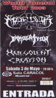 Immolation repetía en España dentro de su gira “Bringing Down The World Tour 2003”, esta vez con unos grupos más adecuados. ¿Qué puedo decir de estos neoyorkinos que no dijera en la otra reseña?, fueron simplemente brutales, perfectos en la ejecución de los temas, si bien es cierto que esta vez no sonaron tan bien como en la Riviera. El vozarrón de Ross no se distinguía lo suficiente y en algunos momentos el pesado sonido de Immolation saturó la sala.