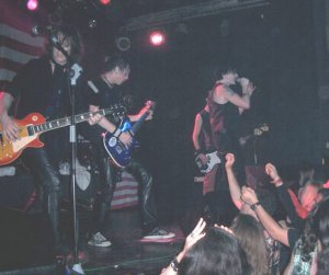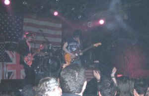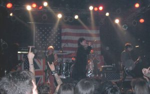 Ante mí, la sala Gamma, con un medio lleno, o medio vacío y el trío tocando para un colectivo que había rescatado pañuelos piratas, camisas de cuadros sin mangas y algún pelo cardado. Unas banderas de USA y UK adornaban el escenario, ¿? El guitarra Monaco y su look a lo Oasis se alternaba cantando con el bajista de pelo zanahoria Chip Z’nuff con su gorra, casaca y gafas de estrellas. Tras “Saturday” reconocí (suerte que tuve) otro tema de ellos,“Right By Your Side”, del “Animals with human intelligence”, al que le siguieron una canción que me sonaba a versión y otra que no sabía cual era.