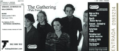 El daño ya estaba hecho, así que ya sólo me quedaba adentrarme en la sala para coger una posición más o menos decente en espera de la salida al ruedo de THE GATHERING. Esta tarea fue bien complicada porque el recinto presentaba un lleno total, de hecho al parecer se agotaron las localidades el día antes, y se notaba claramente que la sala se había quedado pequeña ante la expectación levantada por la nueva visita del quinteto a la capital de España.