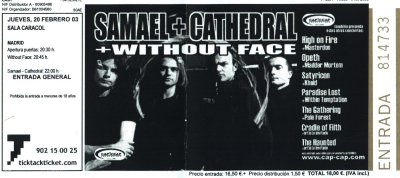 Bajo el nombre de “Redemption Tour 2003” giraban por Europa estos tres grupos que podríamos meterlos muy grosso modo en el saco del ¿Metal Extremo?, pero en realidad muy diferentes entre si en sus propuestas musicales. Curiosamente la banda encargada de cerrar los conciertos, los suizos Samael, no sacan disco desde aquel “Eternal” (1999). Quizás los que deberían haberse encargado de tal honor eran los ingleses Cathedral, presentando su “The VIIth coming” (2002), aunque finalmente se puede decir que encabezaban la gira las dos bandas, ya que tocaron más o menos el mismo tiempo. La fecha de Madrid fue la primera de las cuatro que realizaban por territorio hispano.