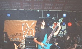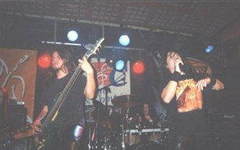Por fin, Manuel Rodríguez (vocalista) dio las buenas noches y presentó la banda, así como un tema que estará incluido en su segundo disco, que trataba sobre la inquisición. Diría que sonaba un poco mal y la batería, un poco a lata, pero el tema en sí era muy bueno; muy cañero, con una voz muy aguda que conseguía hacer unos gritos muy rasgados. Además, me agradó comprobar que ya no sonaban tanto a Maiden y que estaban encontrando un estilo más propio y original. Siguieron con temas por todos conocidos: “Condenado a vivir” y la increíble “Muerte sobre un papel”, coreada por el respetable. He de reconocer que el sonido era bastante mejor que algunas de las salas “más importantes” de Madrid, aunque a veces el bajo saturaba demasiado. Aun así, esto tenía su punto, pues el nuevo bajista era bastante bueno y las bases tan a lo Harris eran dignas de ser escuchadas perfectamente. Tras un largo coreo del nombre de la banda, presentaron otro tema nuevo: “Sangre de Egipto”. ¿Un poco típico, quizás? Eso no importa demasiado cuando los teclados iniciales son tan bonitos y la melodía de la voz te llega tanto como era el caso. Además, se hacía más emotiva aún por ser dedicada al antiguo bajista (allí presente).