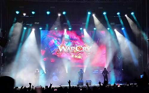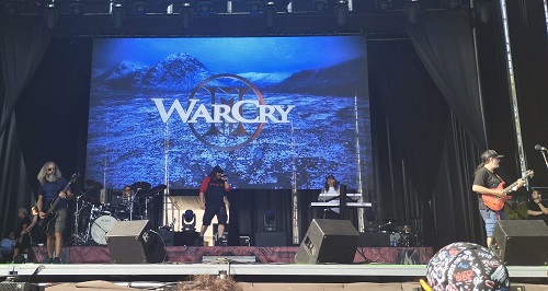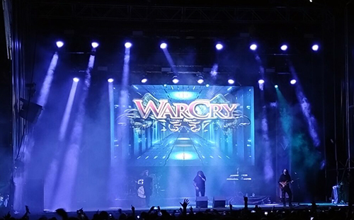 El calor no cesaba, así que entre bandas y el cambio de escenario nos fuimos a tomar algún refrigerio y algo de comer, pero apenas dio tiempo a degustar nada y antes del comienzo de los protagonistas de la noche, WarCry, que comenzaron a las 22:30 h. de la noche con su espectacular intro, que mostraba imágenes de su más reciente disco que presentaban junto con los símbolos que acompañan a cada uno de los integrantes. Todo para acabar con la puesta en escena que han adoptado para la temática de la gira: Todos ellos vestidos de negro, con el símbolo de cada uno en el pecho y una escenografía digna de las grandes bandas internacionales.