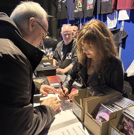 Nos miramos asombrados y, por supuesto, bajamos de inmediato, llevando una gran bolsa con lo que había preparado: CDs de “Kiss In A Dragon Night” y “Tiger”, además de algunos vinilos picture disc de “Kiss In A Dragon Night”. En efecto, en el puesto de merchandising había gente esperando para felicitar al grupo, hacerse fotos y comprar los CDs. Fueron muchas las felicitaciones que recibieron y los buenos comentarios que nos hicieron llegar. Me llamó la atención uno de los asistentes, totalmente entusiasmado con la banda. Nos dijo que él era guitarrista y que estaba alucinado con el nivel de Gustavo Martín, y que la banda era buenísima. Y que compraría todo lo que tuviéramos disponible. Y así hizo, adquirió los 2 CDs y el picture disc. Y porque no teníamos más cosas, se hubiera llevado lo que fuera. ¡Qué pasión!