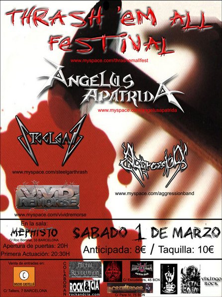 ¿Qué pasó exactamente en esas fechas? Por un lado, tenemos la explosión del “revival” a nivel internacional, con lanzamientos por parte de nuevas bandas y de las ya míticas. Por estos lares el fenómeno, sin llegar a “explotar”, ya empezaba a removerse. Así, en 2007, un concierto con jóvenes bandas catalanas como Aggression, Vivid Remorse y los desaparecidos Steelgar tuvo un notable éxito en la sala Banda Sonora, en Sant Adrià del Besòs. Dicho cartel se repetiría, con un añadido más que notable (los albacetenses Ángelus Apátrida) en 2008, en el Thrash’em All Fest de Barcelona. Podríamos decir que estos dos conciertos fueron el origen de buena parte de la recuperación del género en Cataluña.