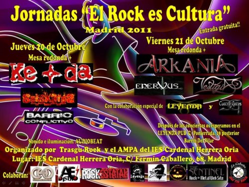 El 20 y 21 de octubre tuvieron lugar en el Instituto de Enseñanza Secundaria Herrera Oria de Madrid unas jornadas llamadas “El Rock es Cultura”, con el objetivo de analizar la situación del Rock en nuestro país e intentar recuperar la presencia que el Rock tenía en los institutos allá por los ’80. Para ello había organizadas ponencias, mesas redondas y, finalmente, conciertos dentro del recinto del instituto, con el ánimo de mostrar a los alumnos del instituto y a todo aquel que si quiera acercar la visión que desde dentro del Rock (músicos y medios) se tiene de la situación actual, abriendo las puertas al público asistente para que expresaran sus opiniones y sus preguntas a los ponentes.