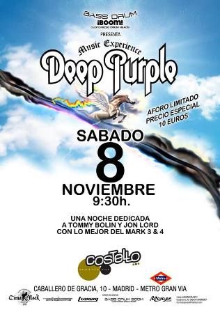 El 8 de noviembre pintaba perfecto. Desde mi Segovia subía el puerto del León (va a pagar peajes abusivos su puta madre) con una sonrisa que no me la borraba ni la lluvia, ni el viento ni la niebla. Esa noche iba a Costello a ver a la Deep Purple Music Experience rindiendo homenaje a Jon Lord y Tommy Bolin y centrando su set en el Mark 3 & 4. Parece redundante tener que explicar que son los Mark dentro de Deep Purple pero no debemos olvidar que continuamente llega sangre joven a nuestro Rock y tal vez sea bueno dejarlo escrito una vez más. Se llama Mark a cada una de las formaciones que ha tenido Deep Purple y son las IV primeras las que así se suelen etiquetar aunque hay quien sigue con la tradición y aún continúan haciéndolo con las demás formaciones.